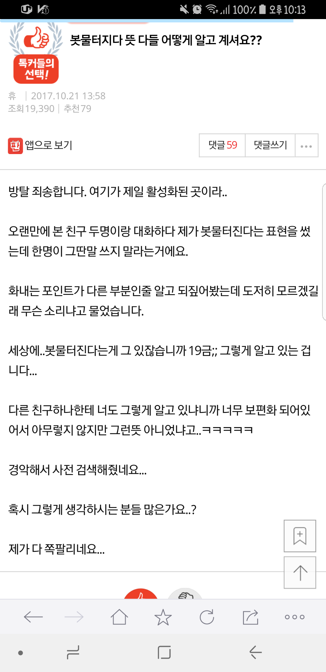 작성자영원할줄알았던 작성시간 17.10.22 ..?오 나 저 단어를 성희롱단어로 쓴다는 거 지금 처음 알음... 봇물터진다는 말 자주 쓰이지 않나;;