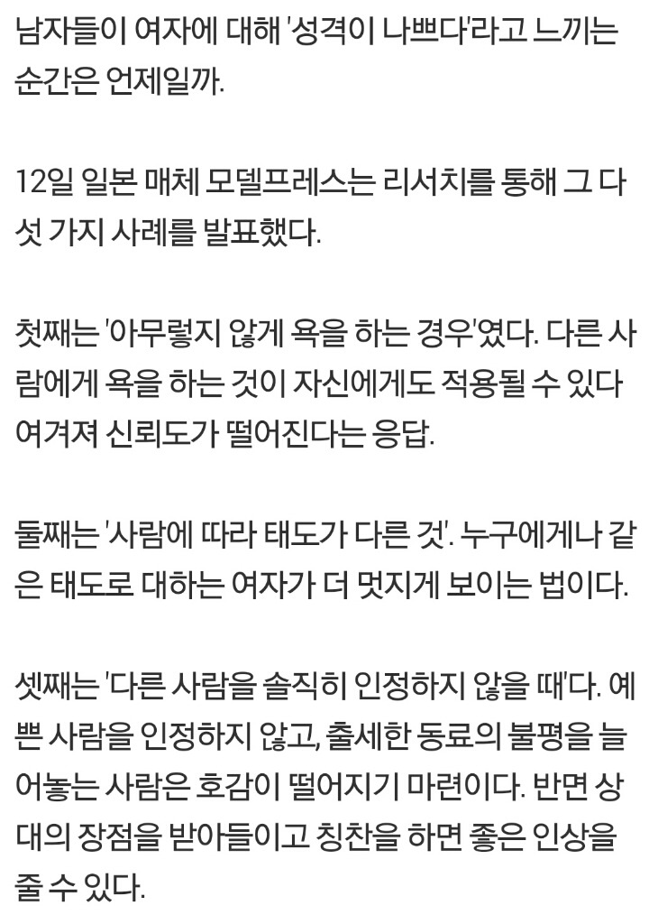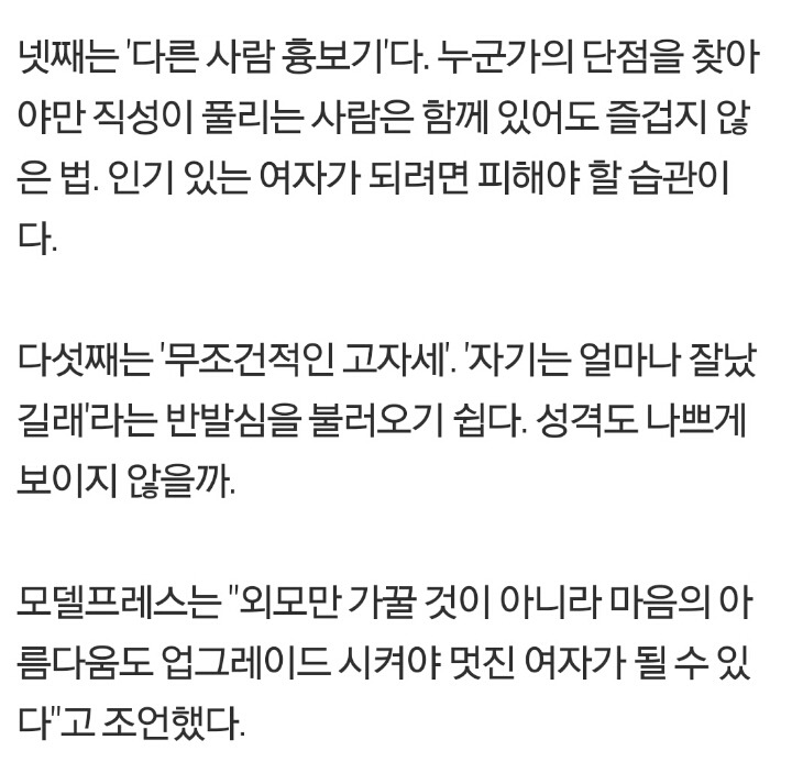 [기타] 예뻐도 무슨 소용?…'성격 나쁜 여자'로 여겨지는 이유 5 작성자Daniel Snoeks(다니엘 스눅스)|작성시간14.10.21|조회수8,393 목록 댓글 1 글자크기 작게가 글자크기 크게가 다음검색 현재 게시글 추가 기능 열기 북마크 공유하기 신고 센터로 신고 댓글 댓글 1 댓글쓰기 답글쓰기 댓글 리스트 작성자라리루레 | 작성시간 14.10.21 이건뭐..멋진사람들의공통점이징..나도저래되고싶다능 댓글 전체보기