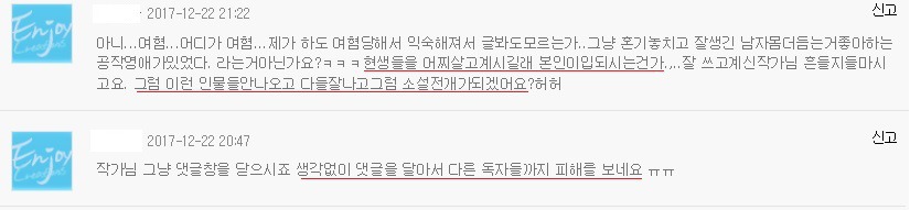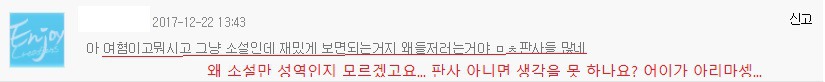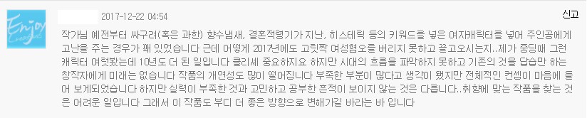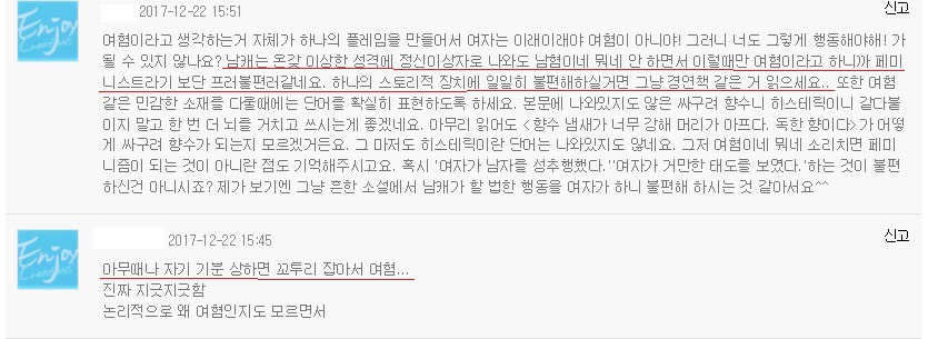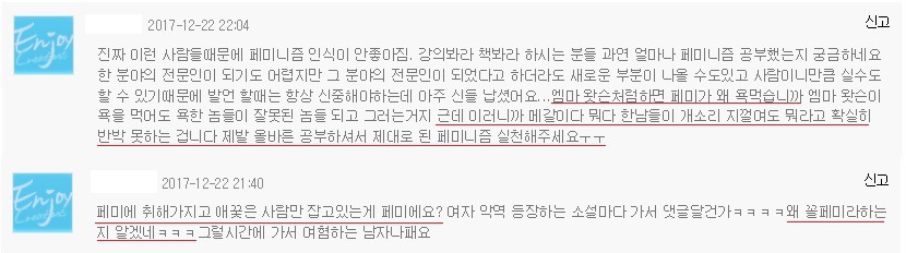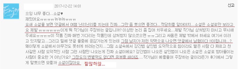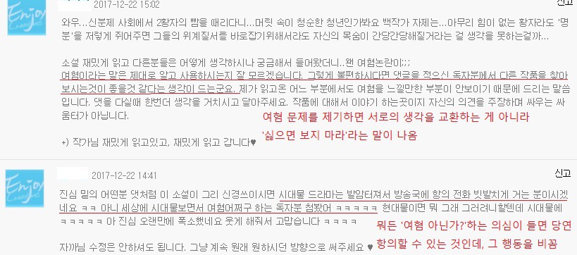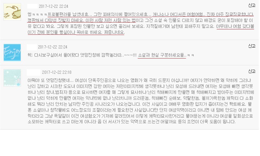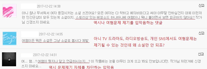 어제 내가 보는 소설에서 여혐에 관한 문제로 독자들 사이에 댓글전쟁이 일어났어.