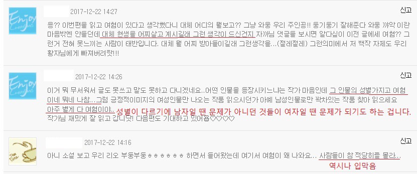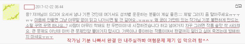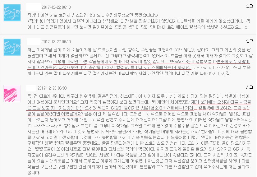 작가님 글쓰는 맛 떨어질까봐 걱정하고, 저런 문제제기하는 댓글들은 무시하고 원하는 대로 쓰시라고 발벗고 나서서 쉴드 침...