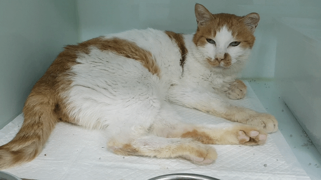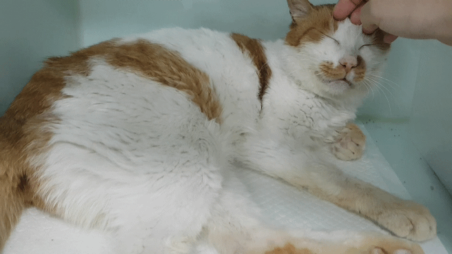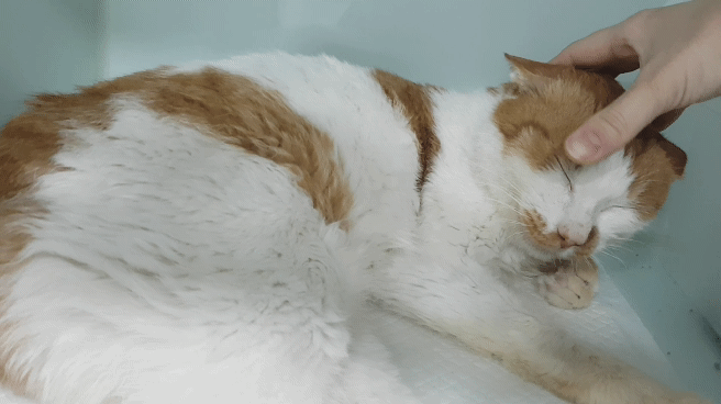 오늘 만나고 온 노랑이예요 아직은 눈만 끔뻑끔뻑 뜨지만 어제보다는 눈도 조금 초롱초롱해지고 제법 반겨주는 눈치였습니다 구내염 발치 자리에 생긴 염증이 아직 다 아물지 않아서 건사료보다는 습식을 잘 먹는 것 같다고 말씀해 주셨고 확실히 허피스는 좋아지고 있다고 합니다! 호흡기 치료랑 염증 치료를 병행하고 있어요