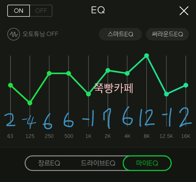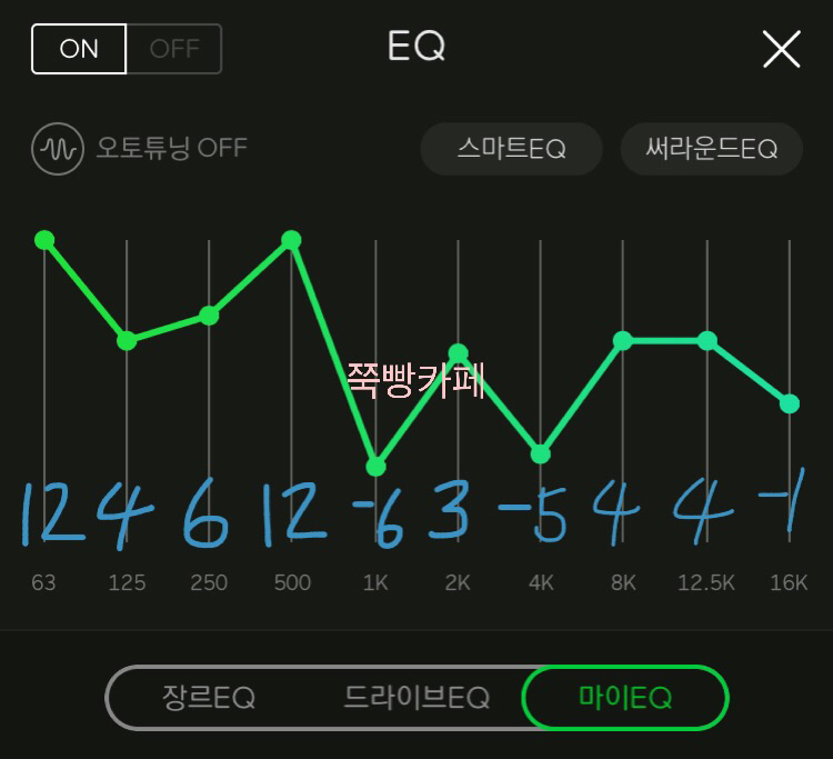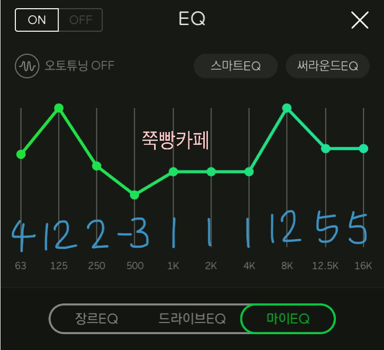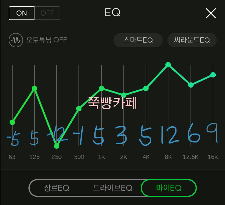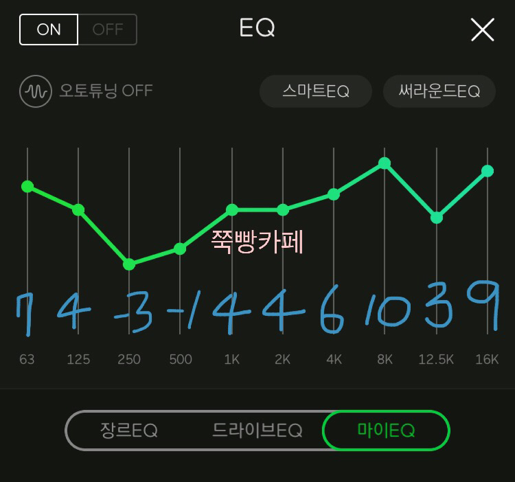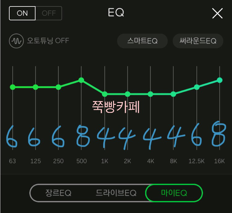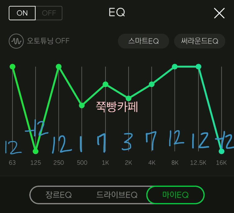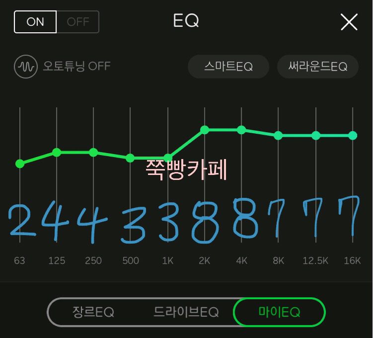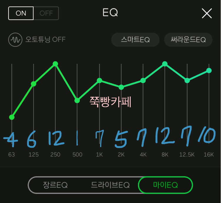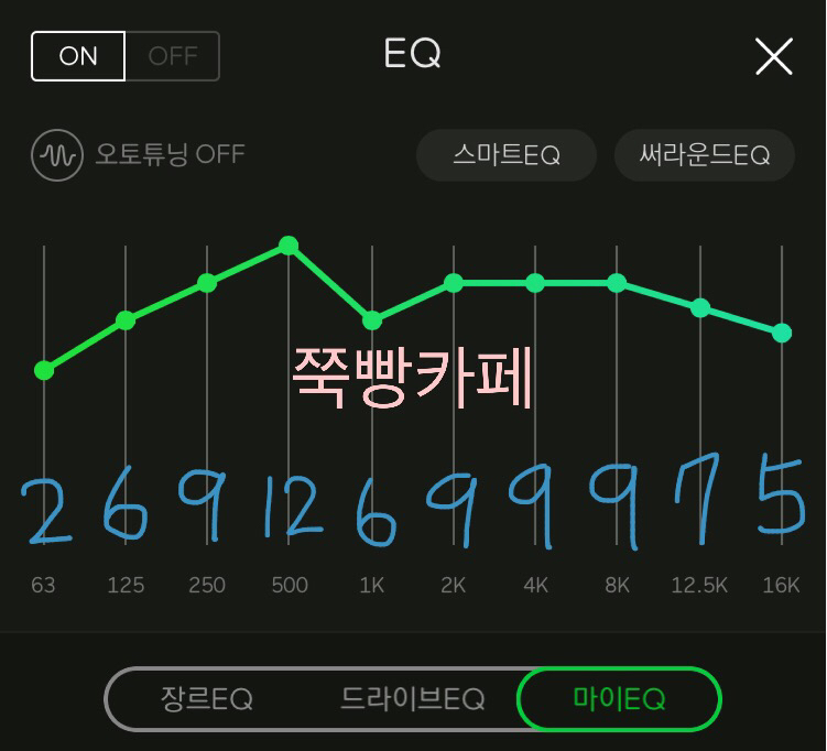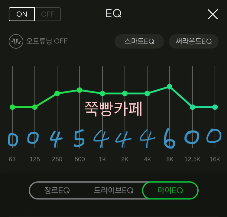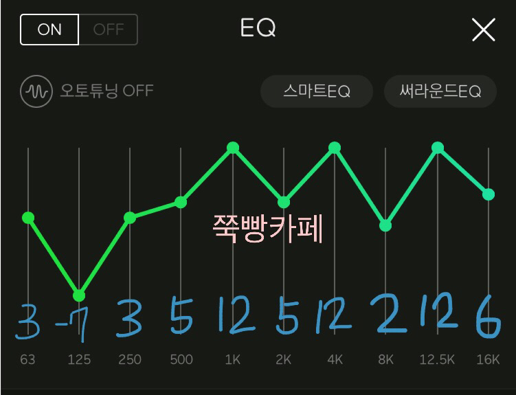 📌 귀를 꽉 채워주는 느낌의 EQ이네요 밖에서 신나는 노래 이어폰으로 양쪽에 꽂고 들으면 내적댄스를 추다가 나도 모르게 춤출 거 같은 느낌