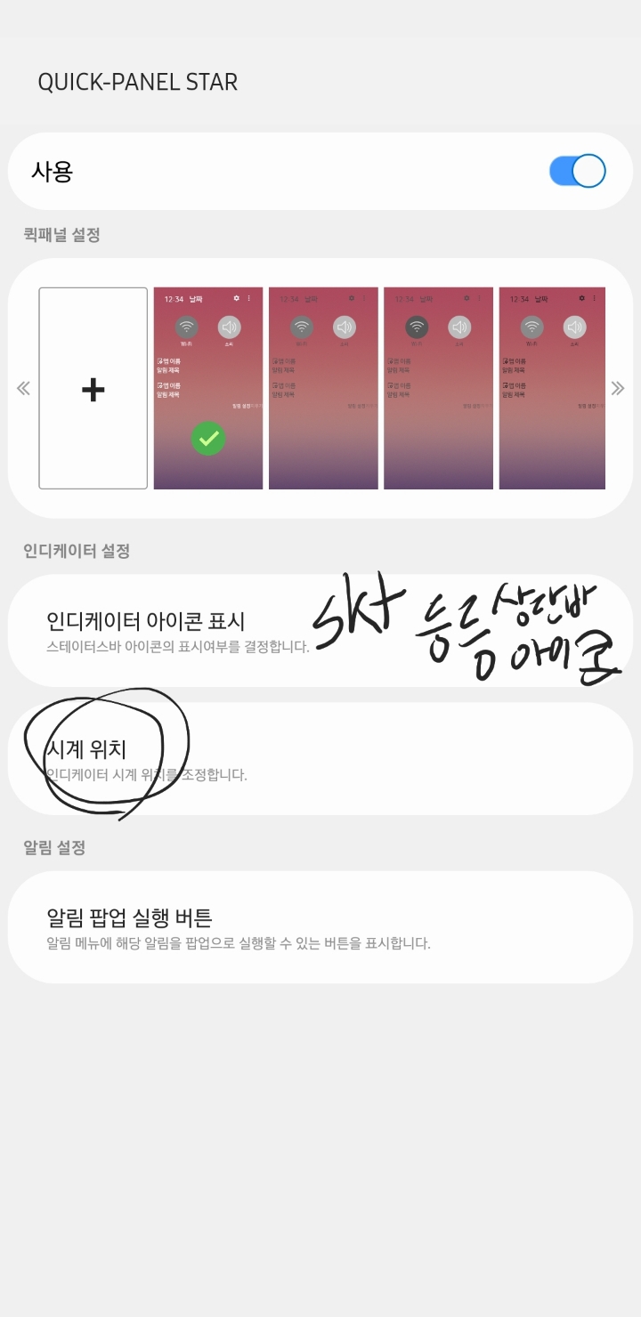 저기서 시계 위치 조절할 수 있고 상단바 아이콘, 상단바 내렸을때 디자인도 마음대로 만들 수 있다!!!