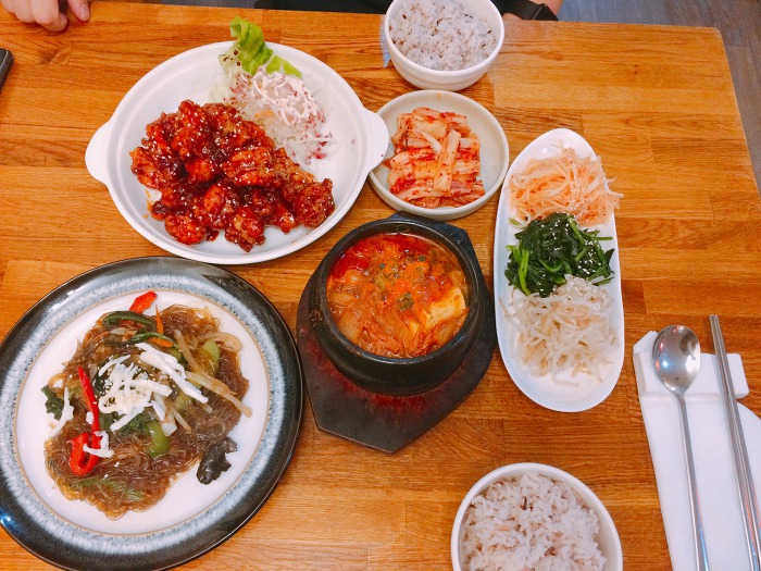 한식 먹기로 한 날 여기 데려가서 잡채, 해물파전, 불고기, 양념치킨, 순두부찌개 이렇게 먹었는데