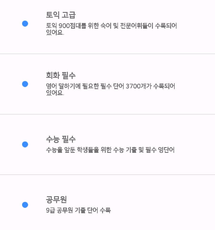 공무원 기출 / 토익 초급/중급/고급 좀 어려운 수준 단어도 공부할 수 있어