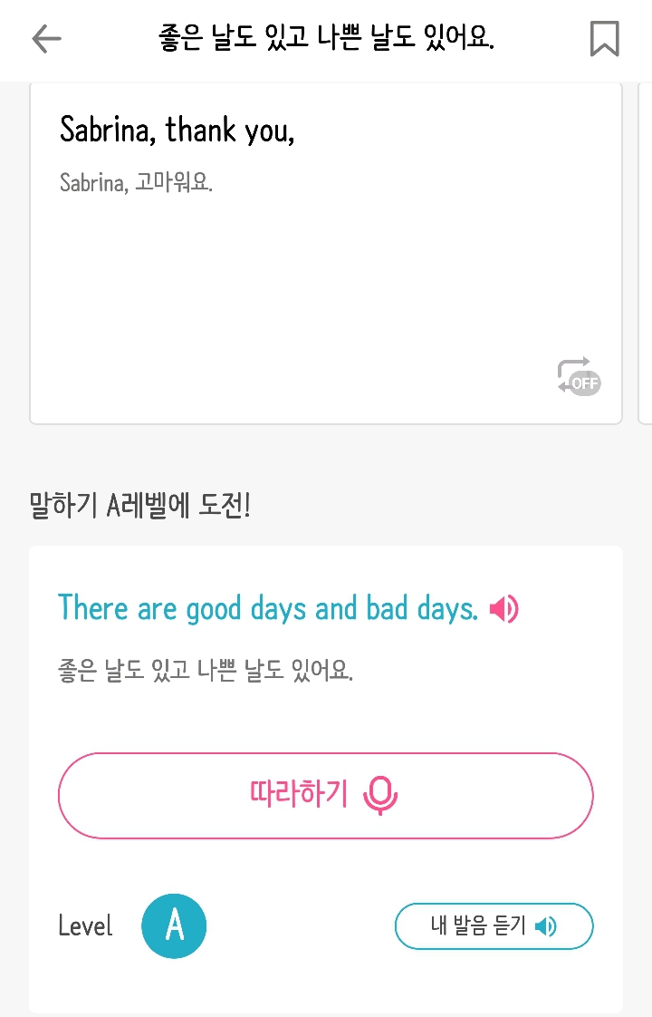 4단계는 듣고 따라하기야! 저 마이크 버튼으로 녹음하고 귀 버튼으로 내 목소리를 듣고 원어민 발음이랑 비교할 수 있어 (비교 결과는 처참하지...)