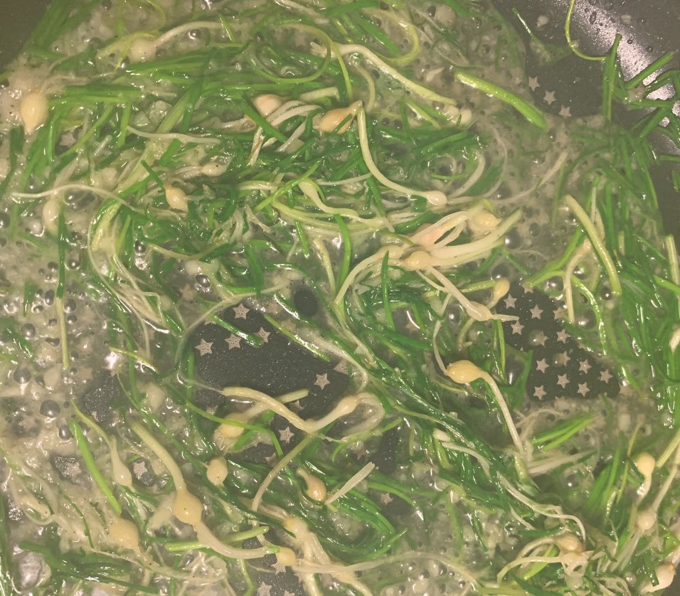 4. 다진마늘이 50%가량 익었을 때 달래를 넣고 함께 볶아주세요.