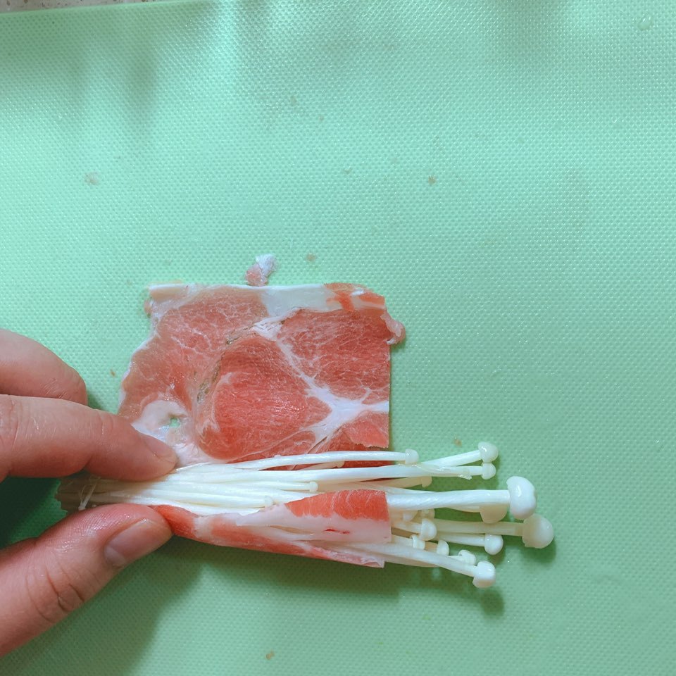 2. 사진처럼 고기를 도마위에 놓고 팽이버섯 올려준 후 돌돌 말아주세요