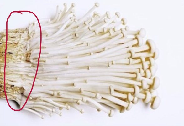 1. 팽이버섯은 사진에 보이는 빨갛게 동그라미 한 부분만 자른 후 씻어주세요.