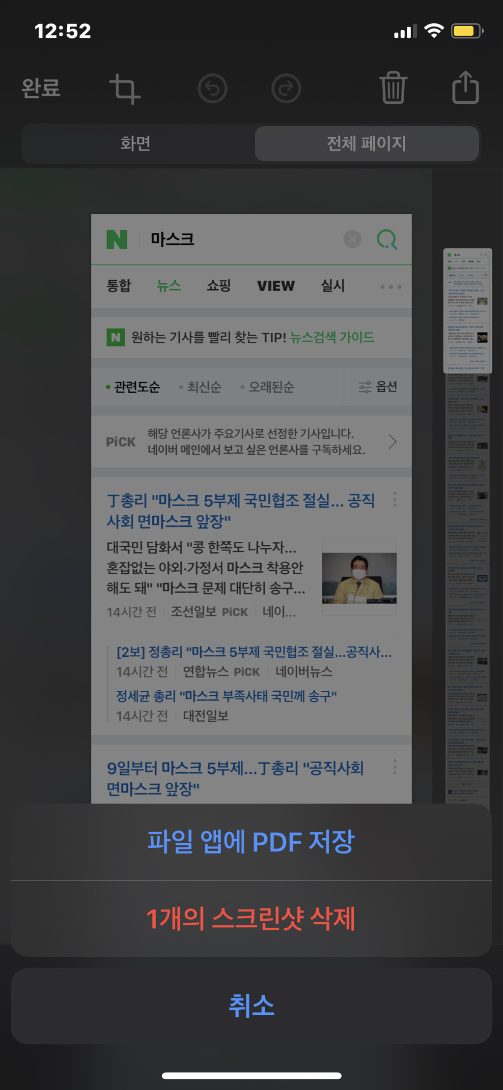 2. 캡쳐하면 왼쪽 아래에 작은 화면 뜨지? 그거 눌러서 전체 페이지로 이동! 완료 누르면 파일 앱에 웅앵 뜬다