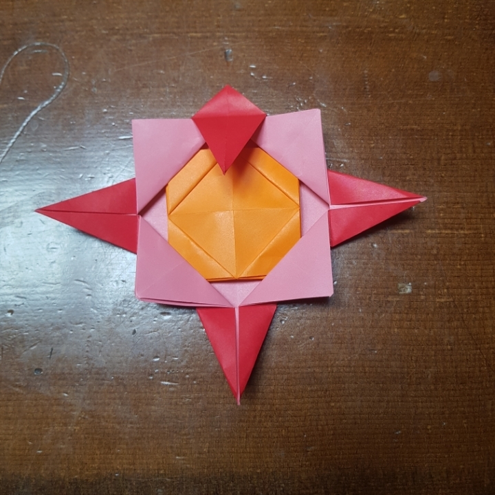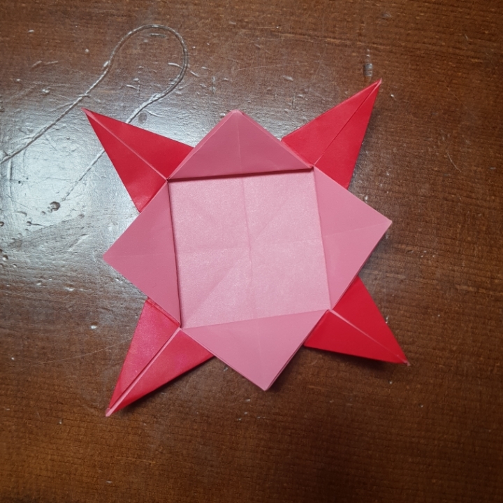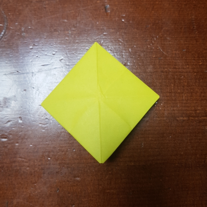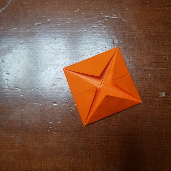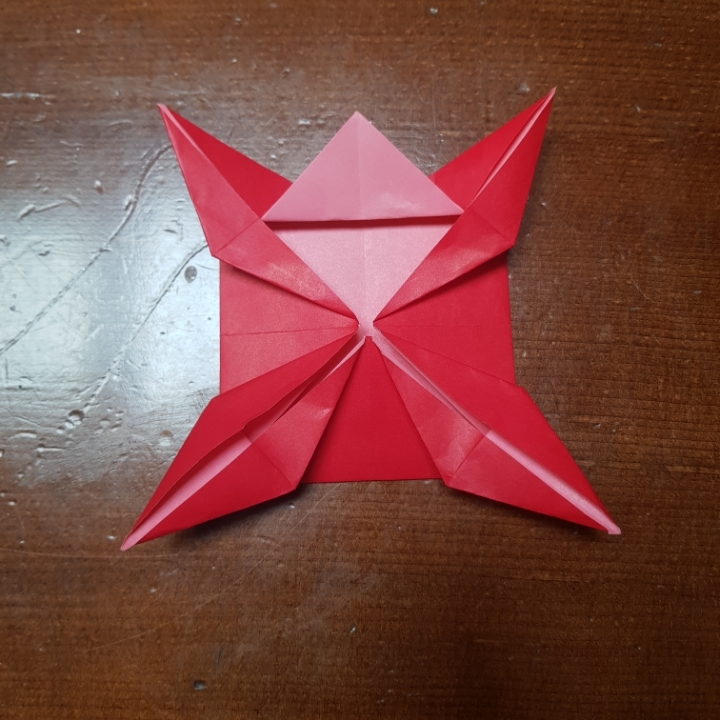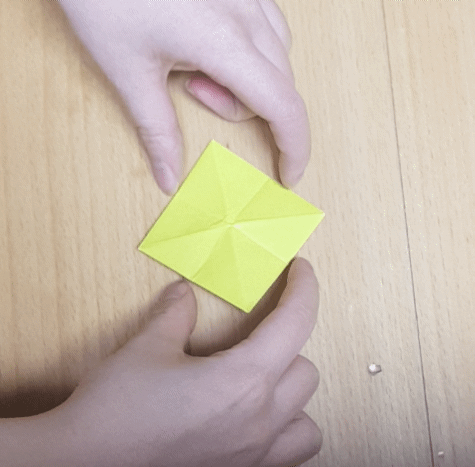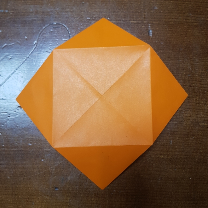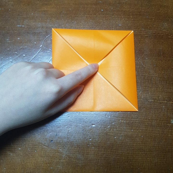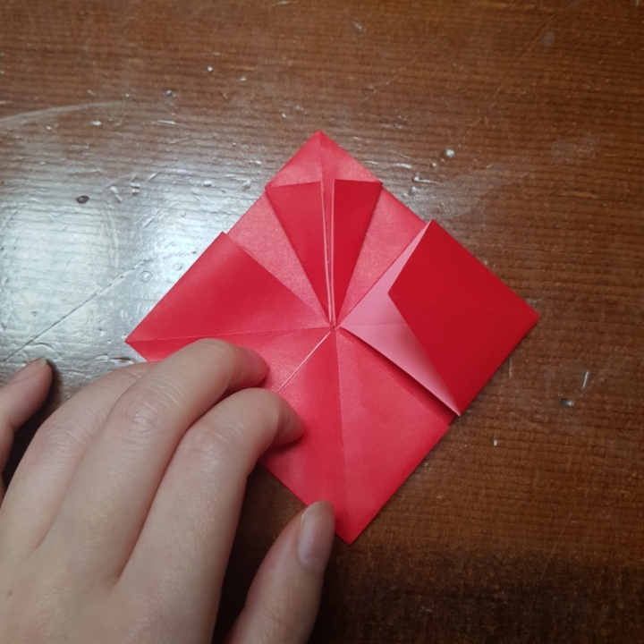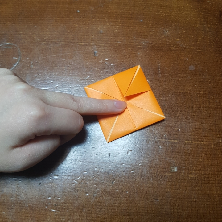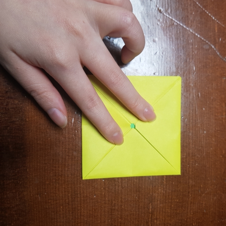 25. 똑같이 세모 두번 접은 후 방석접기를 해줍니다. 이때 가운데 점에서 조금 거리를 두어서 접어줍니다.
