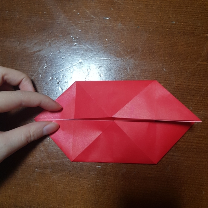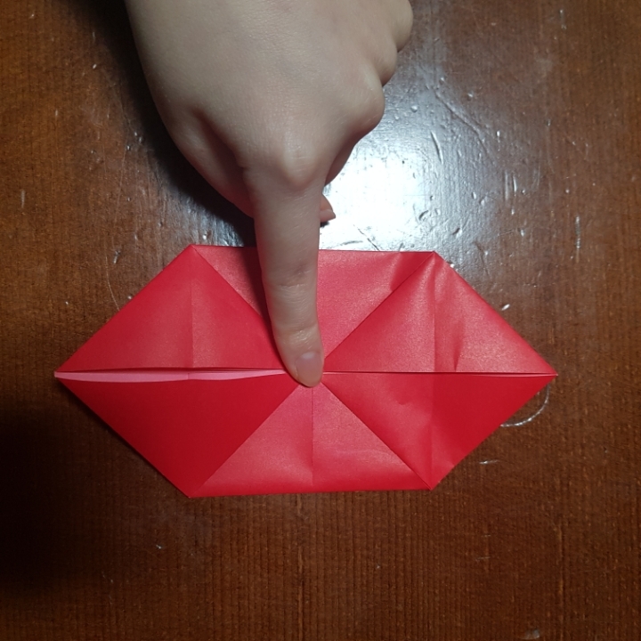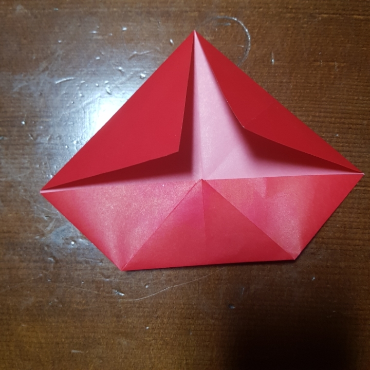 14. 저 마름모 가운데 보면 선이 있을거예요. 그선까지 오도록 세모를 접어줍니다. 헷갈린다면 사진을 봐주세요.
