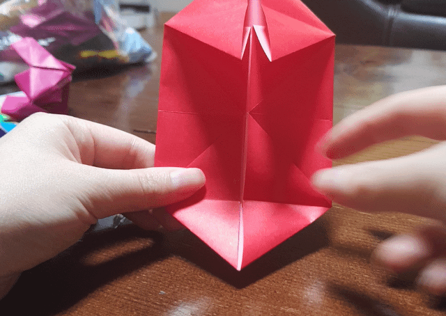 31. 각 면 가운데에 있는 선 보이시나요? 그 옆에 손을두고 쭉 밀어주세요. 움짤처럼요. 그럼 세번째 완성~~
