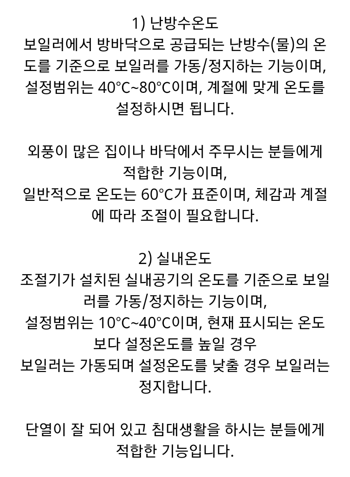 * 실내온도 설정해두고 온도 올리면 단열이 안 되거나 보일러 조절기 근처가 춥거나 하면 아무리 높은 온도로 돌려도 일정 온도 이상 안 올라가는 집도 있으므로 어떤 방법으로 온도 올릴지는 각자 해보고 선택하기 바람