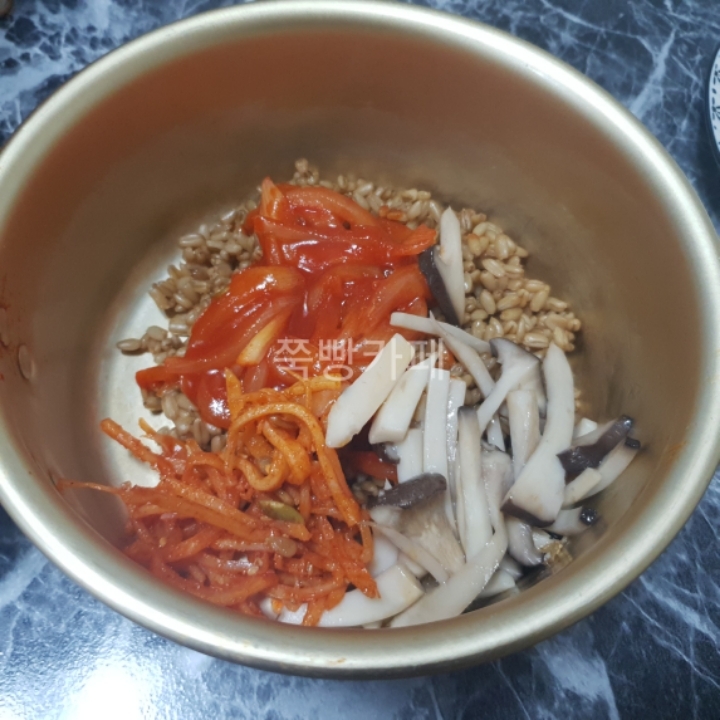 밥위에 준비한 양념장 두큰술이랑 버섯 넣어줘~~
