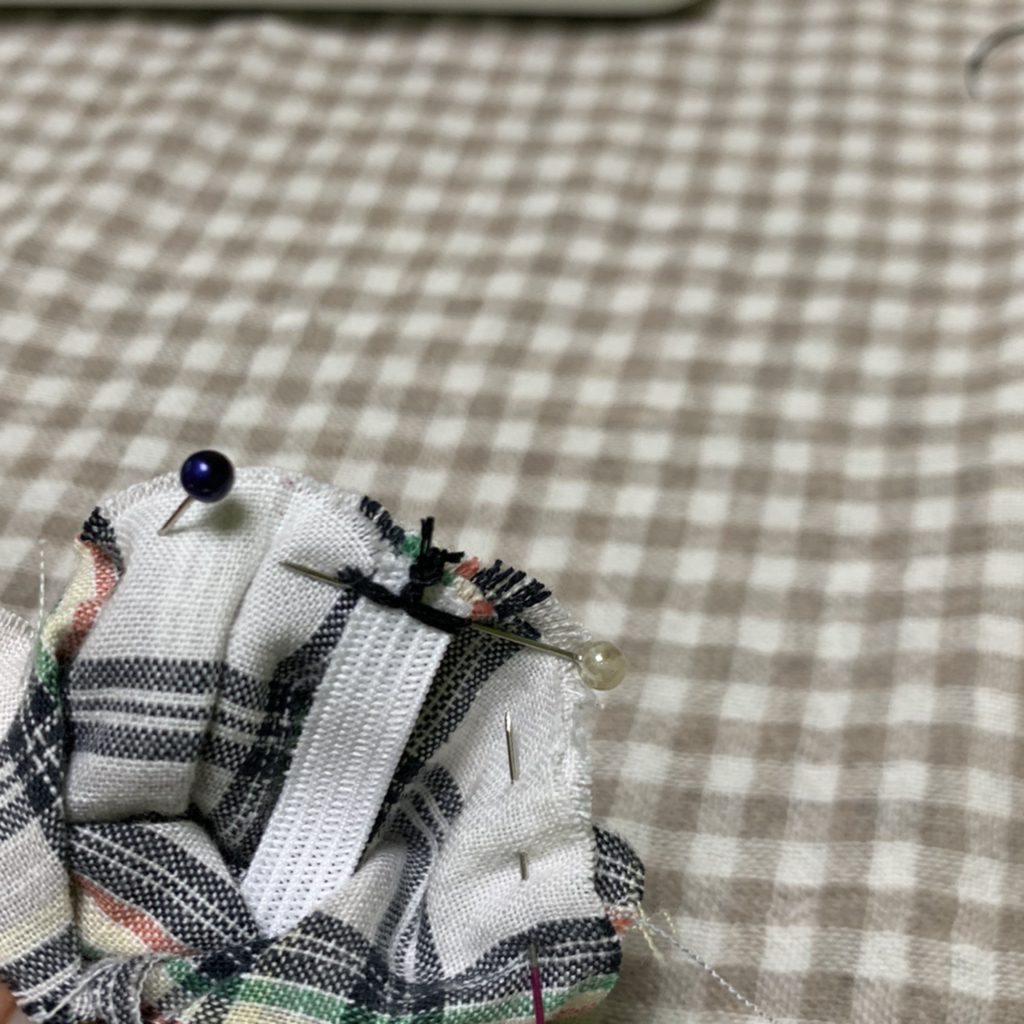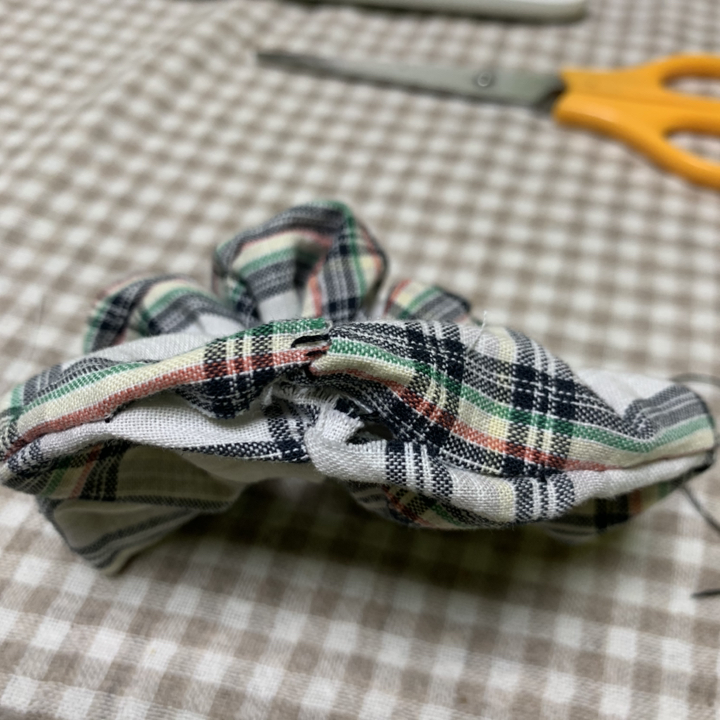 뒤집기 전에 양쪽에 고무줄을 이어줬었잖아 그 부분을 3번째 사진처럼 마주보게 해서 거길 또 바느질 해 주면 돼!