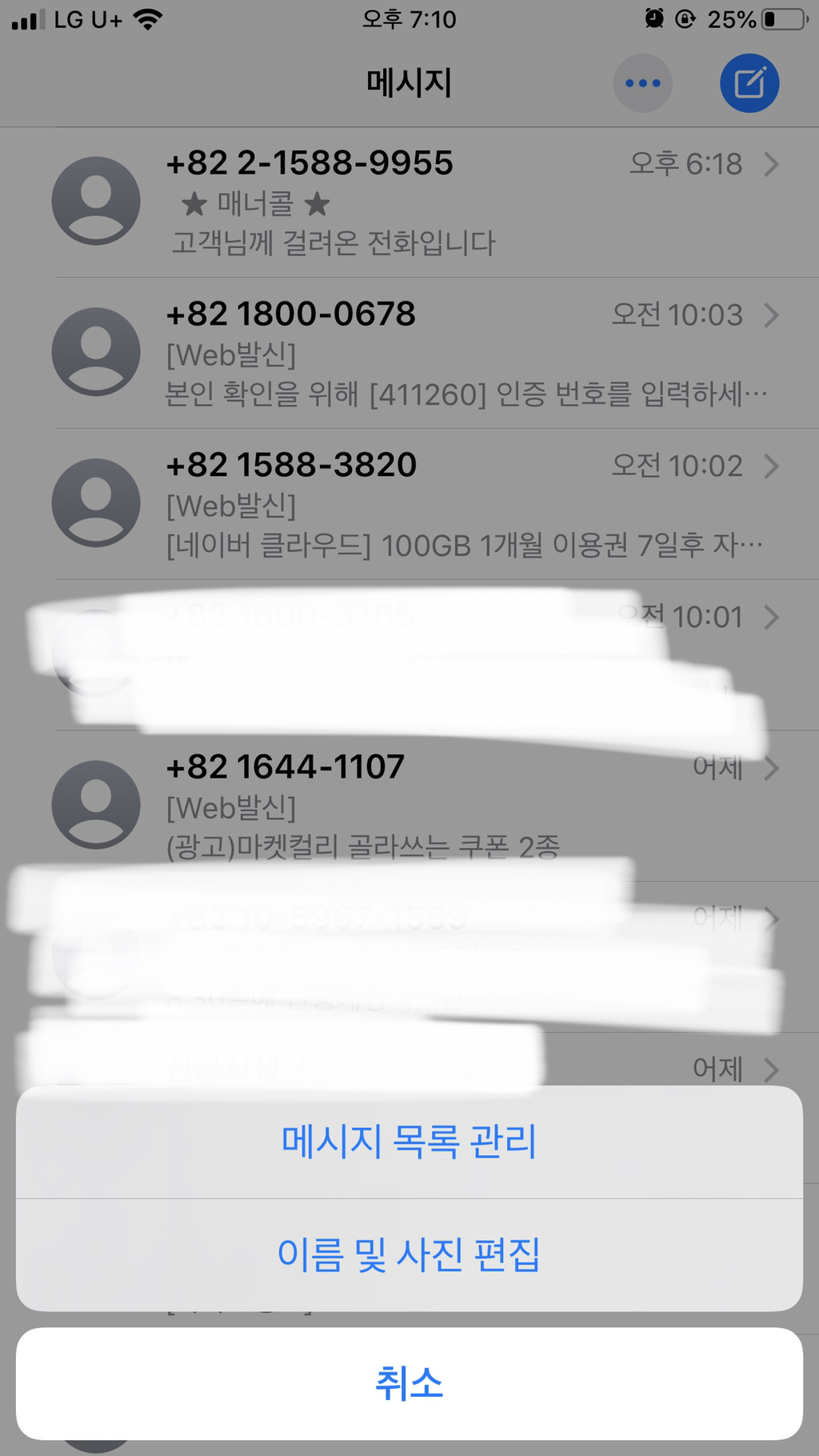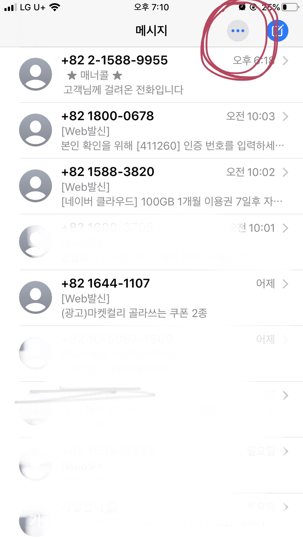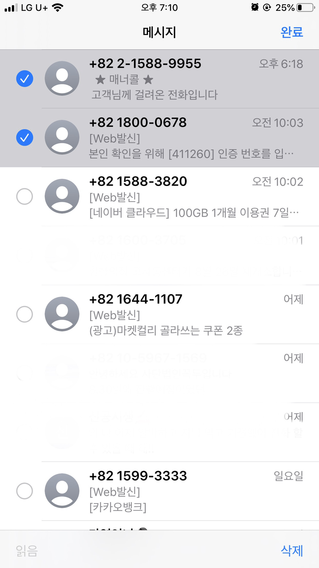 메시지 목록 관리를 누르면 저렇게 체크할 수 있는게 나와서 삭제하고 싶은 메시지 체크하고 완료 누르면
