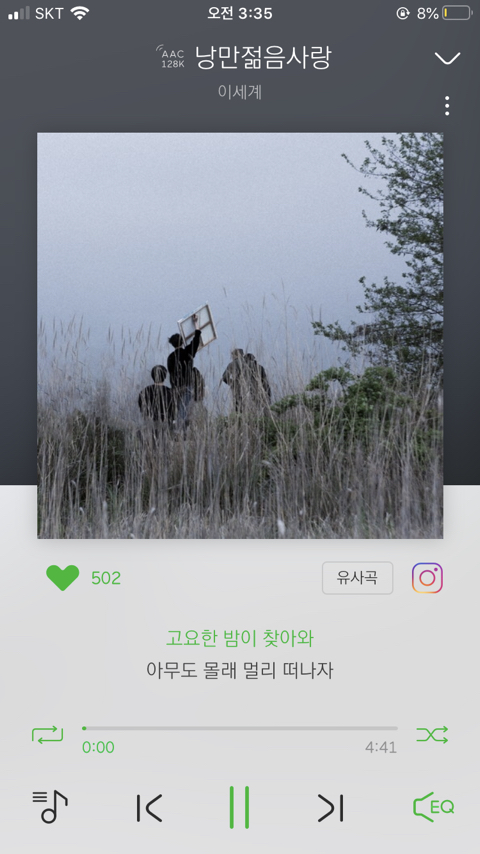 내 생각에 이 노래는 청계천 밤이나 노을 지는 바닷가에서 듣고 싶은 노래야 정말 제목 그대로 낭만 젊음 사랑에 어울리는 노래 ••• ❤️