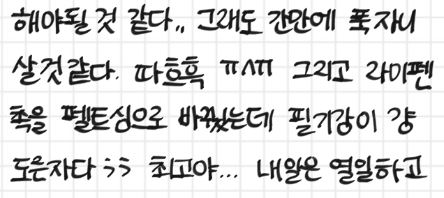 라미펜이 조금 더 얇게 써지고, 확실히 그립감이 좋아서 그런지 글씨가 더 예쁘게, 편하게, 빠르게 써지는 느낌이야
