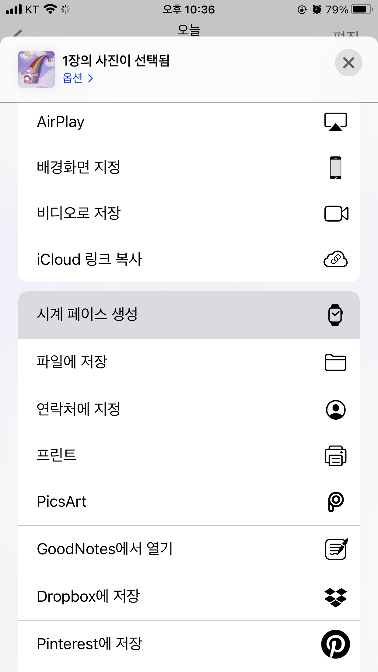 그리고 마지막으로 사진 공유 버튼 눌러서 시계 페이스 생성! 그 후 취향에 맞게 설정하면 끝
