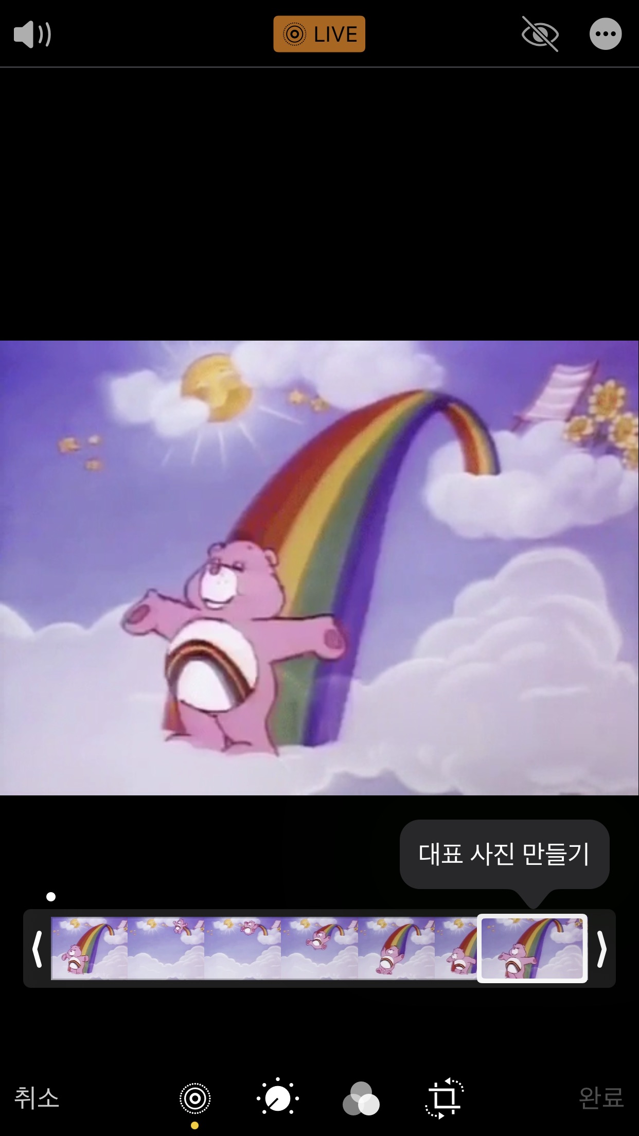 보통 라이브포토는 맨 처음 사진이 대표사진으로 되어있을 건데 맨 뒤로 쭉 당겨서 마지막 컷을 대표 사진으로 만들어줘야함!!! 대표사진만들기 버튼 누르고 완료 누르셈