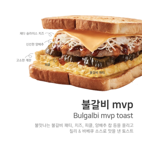 불갈비 패티가 되게 두꺼운 편이라 씹히는 맛도 있어! 아마 패티가 들어간 토스트 종류 중에는 가장 베이직한 맛이 아닐까 싶어! 조금 물릴 수도 있는 맛인데 가끔 딸기주스랑 먹으면 환상의 조합이야ㅠㅜ 우리지점만 그런지는 모르겠는데 주로 40~50대 아저씨들이 정말 많이 시켜먹는 종류야! 아마 부모님들이 선호하실거같아