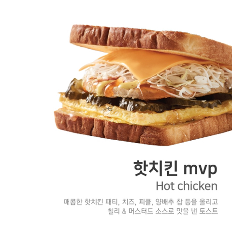 잠깐 단종됐었다가 다시 출시 된 핫치킨이야! 핫치킨 패티랑 머스터드소스랑 칠리소스가 들어가는데 소스 조합이 진짜 환상이라서 너무 맛있어 ㅠㅜ 아 그리고 핫치킨이라 가끔 매운 토스트냐고 물어보시는 분들 계시는데 전~혀 안맵고 핫치킨 패티가 정말 아주 미세하게 매콤한 향을 내 ! 근데 초등학생도 잘 먹을정도야.. 어느정도인지 알겠니? 하나도 안맵고 진짜 중독성 있는 맛이야..