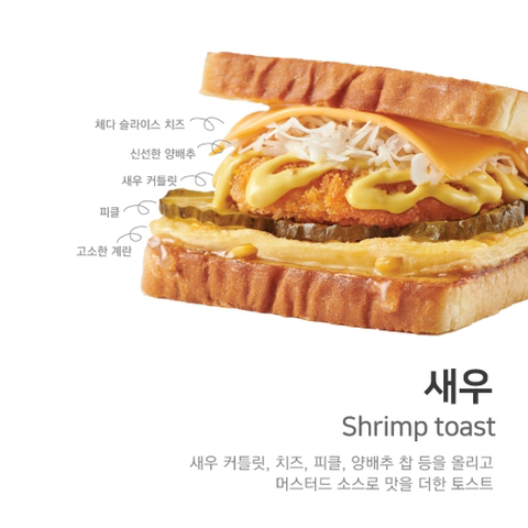 난 기대 하나도 안하고 먹었는데 패티가 통새우가 들어있어서 진짜 맛있고 머스터드랑 새우랑 진짜 의외로 너무 잘 어울리더라 ㅠㅜ 모짜렐라 치즈 추가하면 더 맛있어ㅠㅜㅠㅜㅠ !!!! 개인적으로 나는 새우버거보다 괜찮다고 생각해 다들 새우토스트 츄라이 츄라이 ~