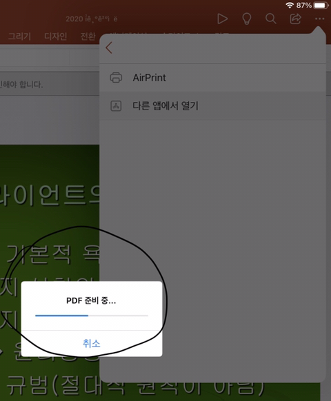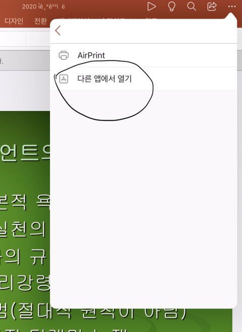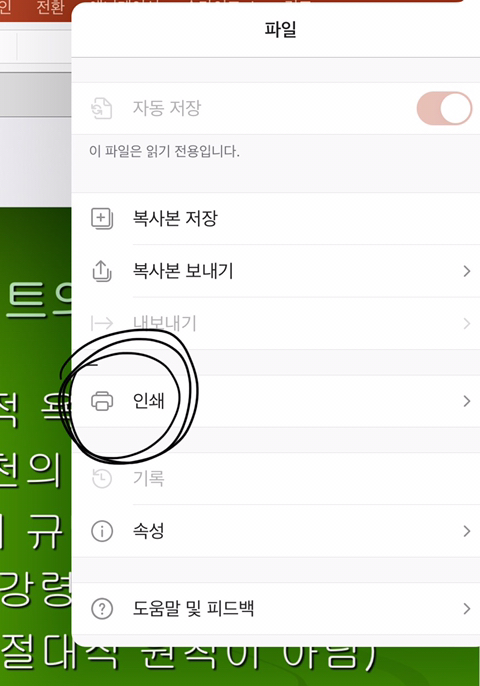 그럼 이렇게 바로 자동으로 PPT 어플 에서 열리는데 위에 동그라미 세개 누르고 인쇄 눌러
