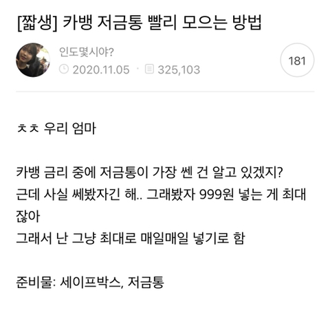 내일 일어나면 저금통에 999원 들어가 있을겨