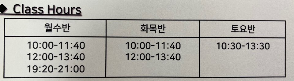 하지만 교차수강이 가능해서 내가 월수 19:20반을 등록했는데 시간이 안 된다,하면 시간표를 보고 월수반의 다른 시간이나 아예 다른 요일 수업을 들을 수도 있어! 딱히 결석하는 건 아닌데 복습하고 싶다? 그럼 월화수목토 다 가도 돼;; 이건 정말 좋은 것 같아 (토요일 수업은 월수반이나 화목반이 두번 할 분량을 압축해서 한 번에 진행한다고 보면 돼!) 하지만 그 전에 꼭 선생님께 먼저 연락드려야 돼!