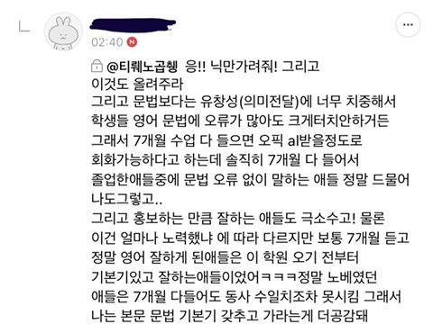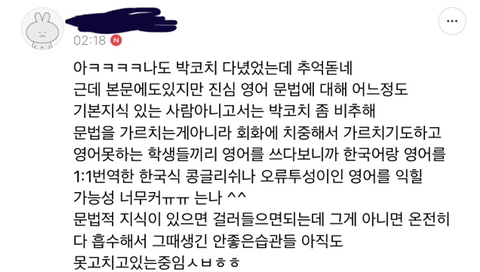 난 박코치만큼은 꼭 영어 문법적 지식이 있는 사람이 가길 추천해. 사실 이 학원의 영어공부 신념은 이거야. 문법을 따로 공부하지 않아도 영어를 많이 듣고 듣다보면 이게 문법이라는 자각도 없이 자연스럽게 문법체계를 이해하고 말하게 된다는 거지. 그런데 내가 다녀보니까 이 방법이 어린 아이들에게 적용하면 효과 있는 방법이지만 중학생 이상의 청소년이나 성인한테는 효과가 없는 방법이라고 생각해. 왜냐하면 내가 다닐 때 학생들 중에 영어공부를 한 번도 안 해봐서 I study English라는 문장을 study I English 이런 식으로 말하는 사람이 있었는데 기초문법을 아예 모르는 상태에서 그냥 말하기만 반복하니까 7개월째에도 발화량이나 단어량은 늘더라도 모든 문장을 그렇게 말하더라고. 학원 내에서 영어로 말 할 기회는 아주 많기 때문에 문법을 아는 사람이 오면 실력을 더 늘려갈 수 있지만 문법 기초가 없는 사람은 사실 말하는 방법을 모르고 말하는 거나 마찬가지이기 때문에 7개월이라는 시간과 몇 백 만원을 낭비하게 될 수도 있어. 그래서 꼭 대단한 수준이 아니어도 되니까 기본적인 문법, 즉 말하는 방법에 대한 공부를 하고 와서 이 학원에서 더 시너지를 발휘했으면 좋겠어. 특히 꼭 주중반을 다니길 추천하고, 다른 반을 다니거나 주중반을 다니면서 학교나 일과 병행하는 건 추천하지 않아. 우선 주중반이 가진 완성된 수업 체계에서 여러 가지를 삭제한 게 새벽반, 저녁반, 토요반이기 때문에 확실히 가져가는 게 적을 거고, 다른 일과 병행하면 영어공부에 100% 집중할 수 없어서 결국 두 마리 토끼를 다 놓칠 수 있기 때문에 가능하다면 휴학을 하거나 일을 쉴 때 꼭 주중반을 다니는 걸 추천해!