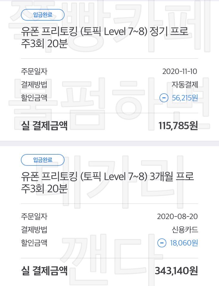 전화영어는 주 몇회냐 / 어떤 시간대에 하냐 / 몇 분 하냐 / 평일이냐 주말이냐 등에 따라 가격이 달라져서 홈페이지에서 직접 본인한테 맞는 걸로 골라서 확인하는 걸 추천할게! 나는 평일 주3일 20분으로 해서 위 사진에 있는 가격으로 결제했어!