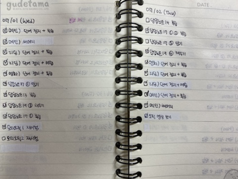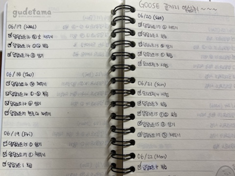 정규 수업을 제외하고도 수업 종료 후 1시간 동안 스터디를 할 수 있어! Goose Egg~Gosling까지는 선택이고 Wild Goose쯤 가면 다들 풀어져서 내가 있을 때에는 담당코치님이 강제로 시키셨어. 원래 스터디 멤버는 한 달 동안 고정인데 Goose Egg 때는 매주 조를 바꿔서 스터디를 했어. 첫 달이다보니 그때 스터디 덕분에 반 사람들이랑 많이 친해졌던 것 같아! 그리고 반이 올라갈수록 스터디는 멤버빨이라는 걸 좀 느끼고 (맞는 사람들이랑 하면 분위기도 좋고 공부 효과도 좋은데 안 맞는 사람들이랑 하면 한 달이 지옥임 으) 그 이후에는 스터디를 안 하고 그 시간에 자습을 하기 시작했어. 그래도 이건 내 주관적인 경험이니까 일단 기회가 된다면 해보는 걸 추천해! 그리고 학원이 수업 종료 후에도 밤 10시까지 열고, 토요일에도 6시까지 열어. 그래서 나는 거의 매일 동기들이랑 자습하고 갔음.. 음 그렇게 할 게 많냐고 물어보면 일단 기본적으로 Input 있지? 매일 배우는 드라마랑 뉴스. 그걸 매일 음성파일을 들으면서 복습해야하는데 그냥 복습이 아니고 누적복습을 해야 해. 수요일이면 오늘 배운 토픽, 지난주 수요일에 배운 토픽, 지지난주 수요일에 배운 토픽... 이렇게 Goose에 가서도 4개월 전 Goose Egg 토픽까지 주기적으로 복습해야해. 그리고 팝송 가사 암기, 드라마 대본 암기 등등 가끔 숙제가 있을 때도 있는데 사실 Input 복습도 그렇고 숙제도 그렇고 안 해도 얼렁뚱땅 조원들에 묻어서, 아니면 코치님이 진짜 대놓고 봐주시는 경우 넘어갈 수도 있어 안 한다고 그렇게 큰 불이익은 없음. 모든 게 자유야. 하지만 그런만큼 실력이 하면 늘고 안 하면 줄겠지? 나는 사진처럼 주말에도 개인 플랜을 세워서 공부했어!!