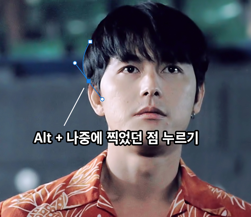 그 다음에 중요한 사실은 다음 점을 찍고 나서도 곡선으로 움직이려면 그 전에 먼저 Alt 키를 누른 채로 두 번째로 찍었던 점을 한 번 더 눌러줘야 한다는 겁니다.