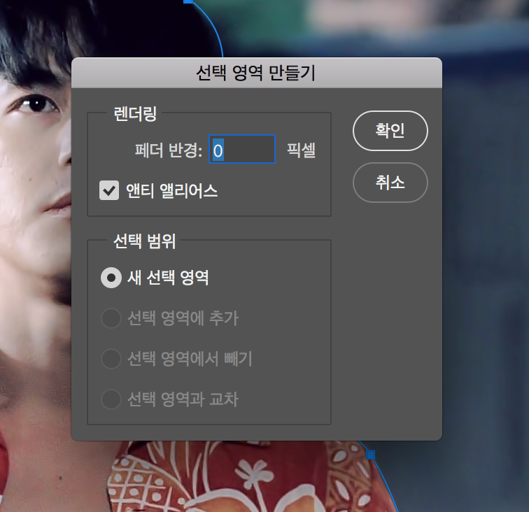 페더 반경을 0픽셀로 설정하고 확인을 눌러 주세요.