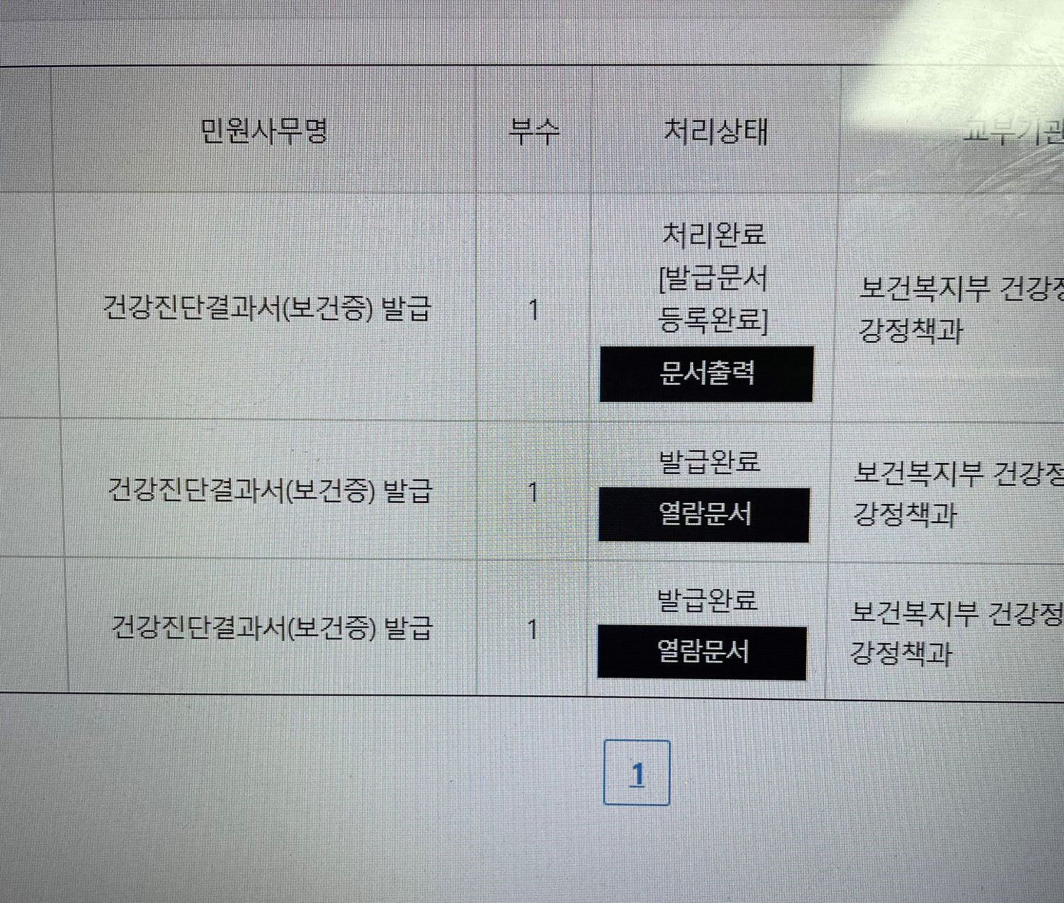 요즘 보건증 검사하면 직접 받으러 오지 말고 온라인으로 뽑으라하지!