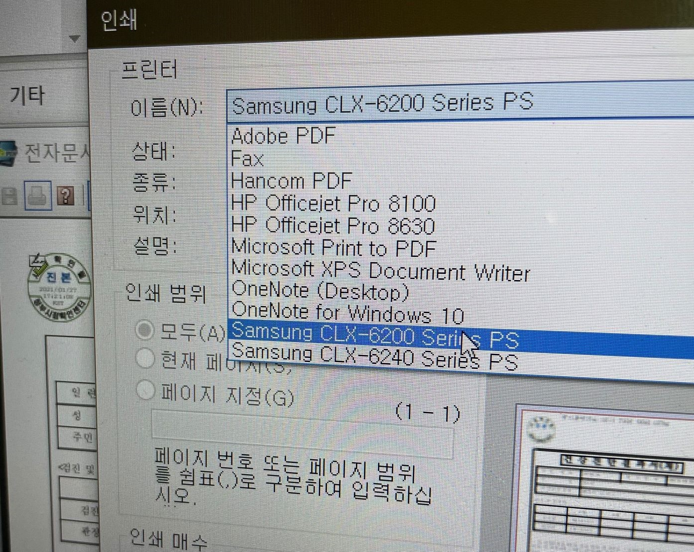 6. 프린터 목록 중에 맨 밑에 삼성 웅앵 두 개가 추가 된 것을 볼 수 있음.