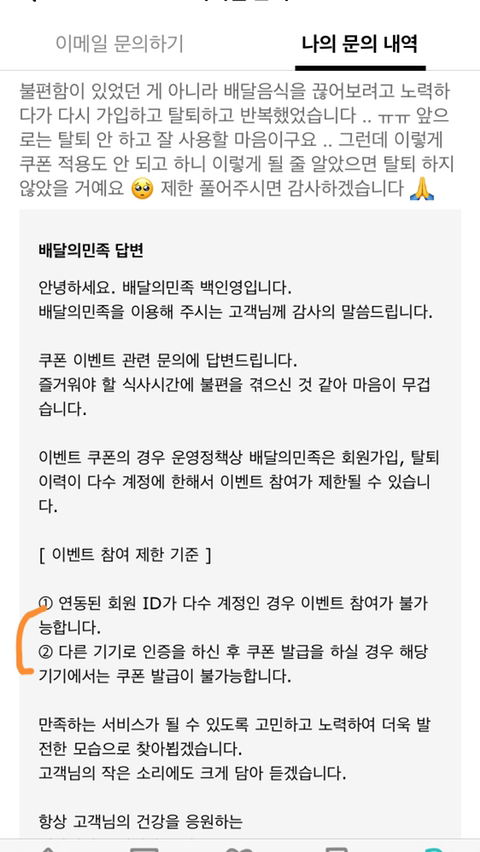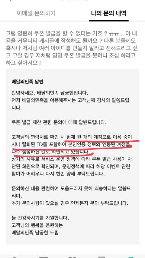 현재는 하나의 아이디만 있고, 다시는 그렇게 하지 않으려고 또 문의를 드렸는데 같은 말씀만 반복 하셨고 탈퇴를 해도 이미 제한되어서 쿠폰 발급은 안 된다고 하시더라고 ㅜㅜ ..