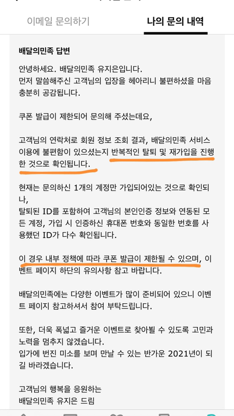 내 정보(휴대폰번호)로 다수의 아이디를 만들면 쿠폰 발급에 제한이 생긴다고 하셨어 ! 내가 이전에 배달음식 끊으려고 탈퇴하고 다시 가입하고 했던 것들이 문제였나봐 ..