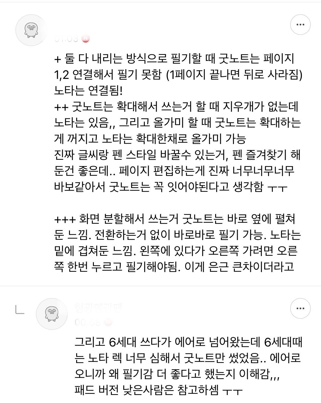 ->게녀들의 의견이 노타가 필기감이 더 낫다고 하는것 같읍니다...🥲 찍었는데 틀렸네유