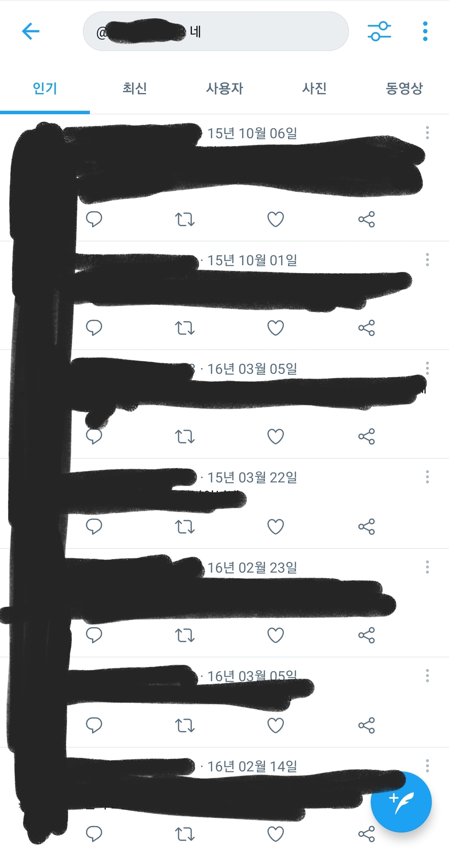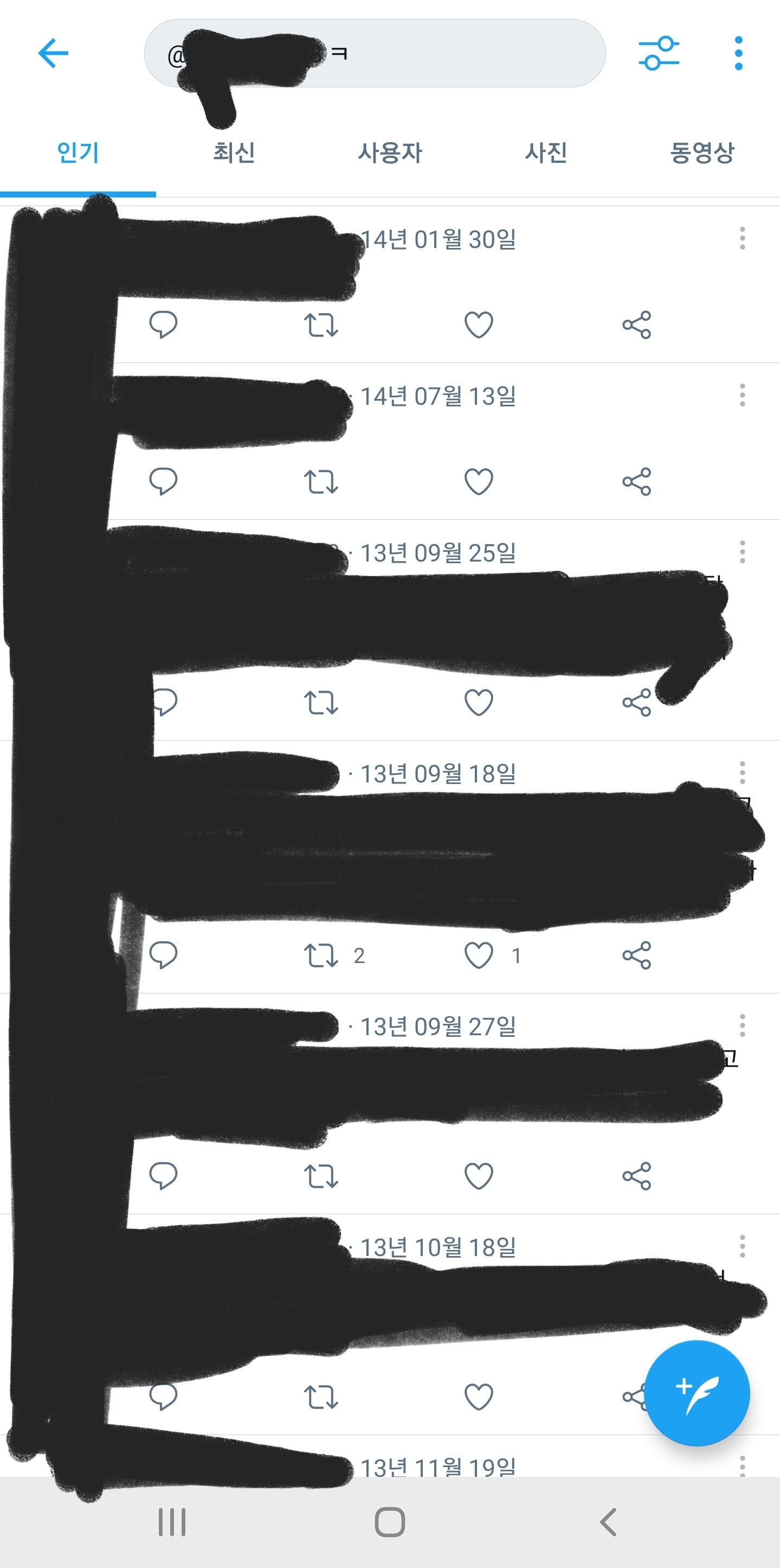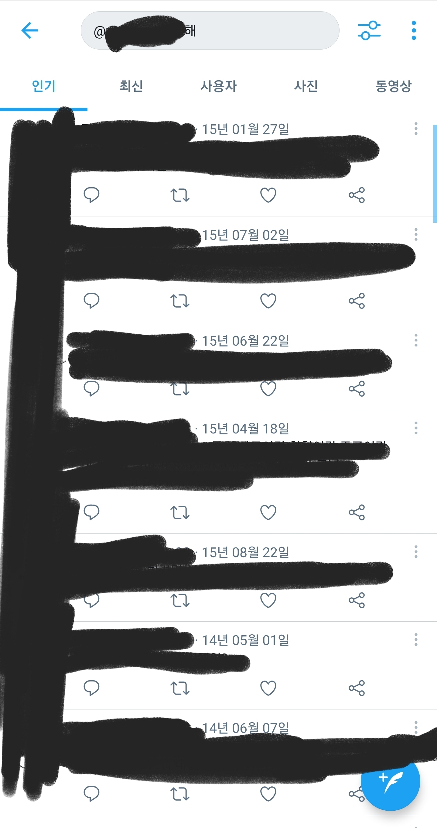 그리고 검색창에 @자기계정 하고 문장에서 자주 쓰는 글자, 단어, 욕 등등 검색하고 나온거 다 하나하나 삭제하기