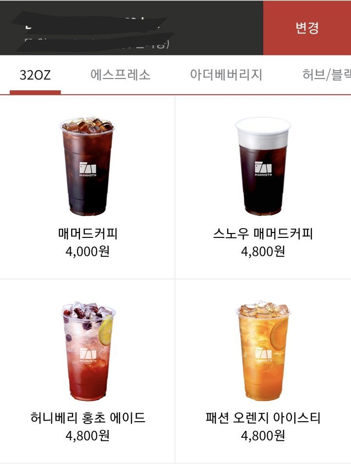 제목에도 적었는데 매머드 커피는 대부분 음료에 파우더를 사용해!!!!! 시럽보다 파우더 단가가 더 세기 때문에 대부분 저가형 카페는 시럽을 많이 쓰지만 매머드는 무적권 파우더임. 에스프레소 음료, 논에스프레소 음료, 스무디 종류에 모두 파우더를 사용해.