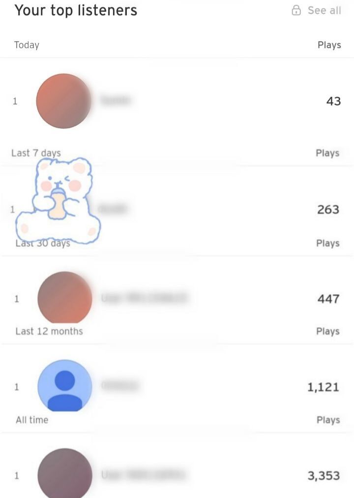 그리고 저걸 클릭하면 탑 리스너를 알 수 있는 기능이 있어.