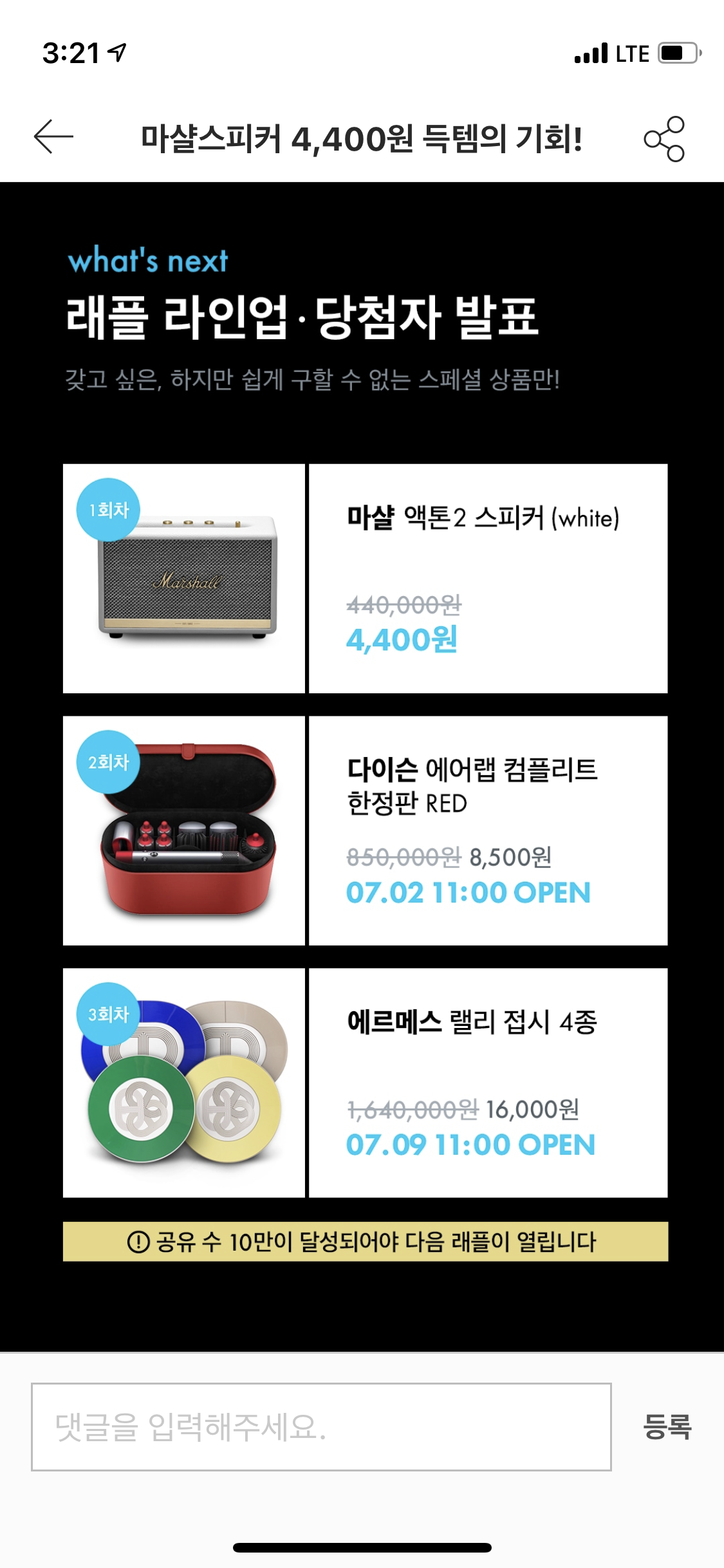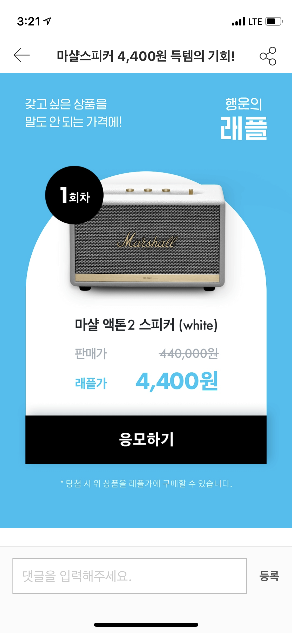 [짧생]오늘의집 릴레이 래플 이벤트 (이번주는 마샬스피커) 작성자파주이아가|작성시간21.06.26|조회수4,262 목록 댓글 3 글자크기 작게가 글자크기 크게가 오늘의집 들어가서 행운의 래플 이벤트 ㄱㄱ응모하기 눌러서 닉넴, 이름, 전화번호 적기당첨되면 4400원에 구매 가능하대~ https://ohou.se/competitions/537마샬스피커 4,400원 득템의 기회!이벤트에 함께 참가해봅시다.ohou.se 다음검색 현재 게시글 추가 기능 열기 북마크 공유하기 신고 센터로 신고 댓글 댓글 3 댓글쓰기 답글쓰기 댓글 리스트 작성자항행나 | 작성시간 21.06.27 말멀 답댓글 작성자파주이아가 작성자 본인 여부 작성자 | 작성시간 21.06.27 했다 고마워! 작성자포테이토박 | 작성시간 21.06.29 마샬은 끝남ㅠㅠ 댓글 전체보기
