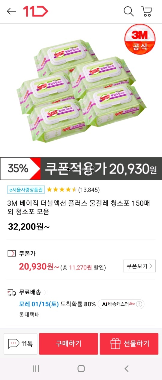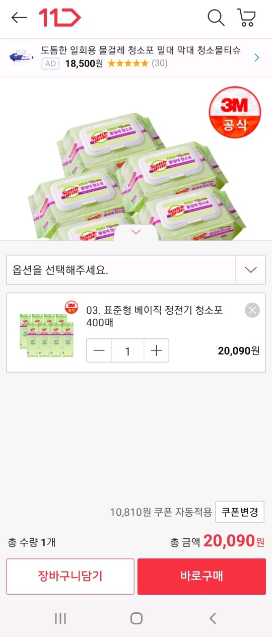 청소포 사려고 보는데 3M 정전기 청소포 400매 20,090원 할인이야~
