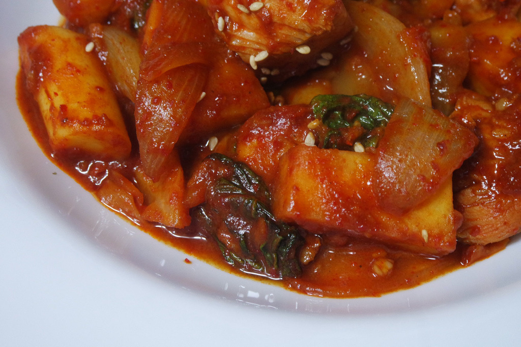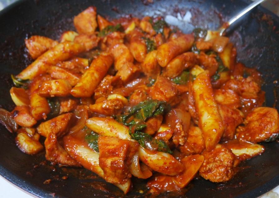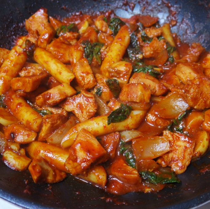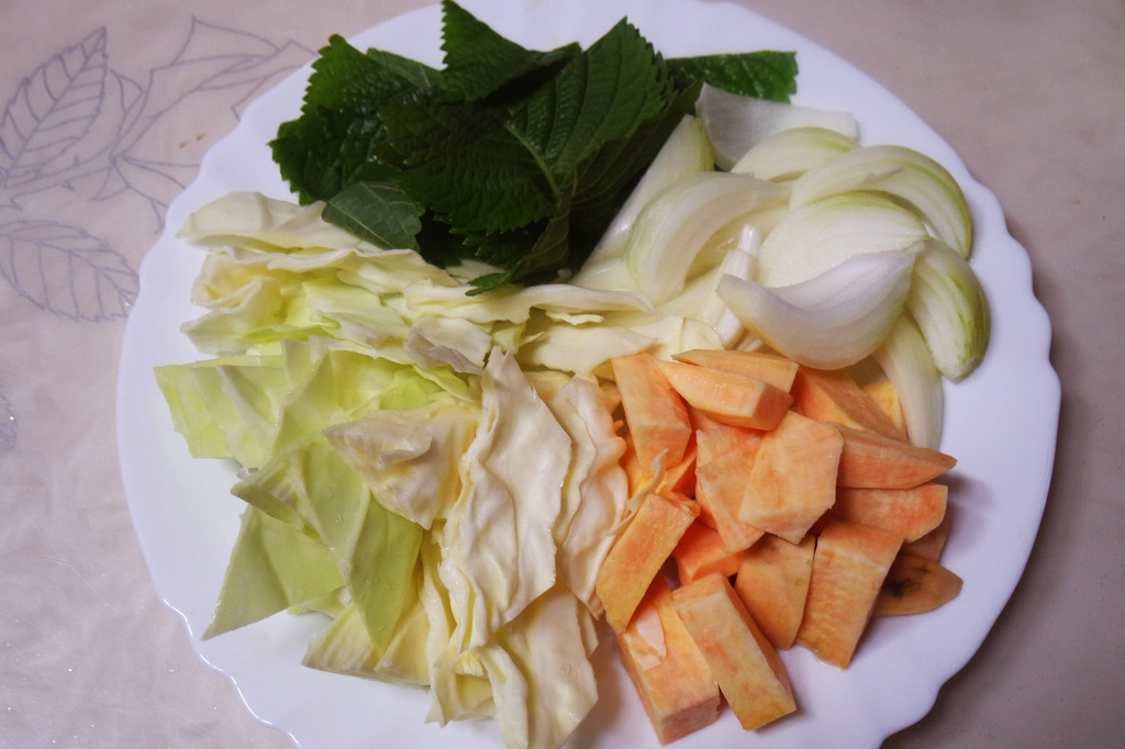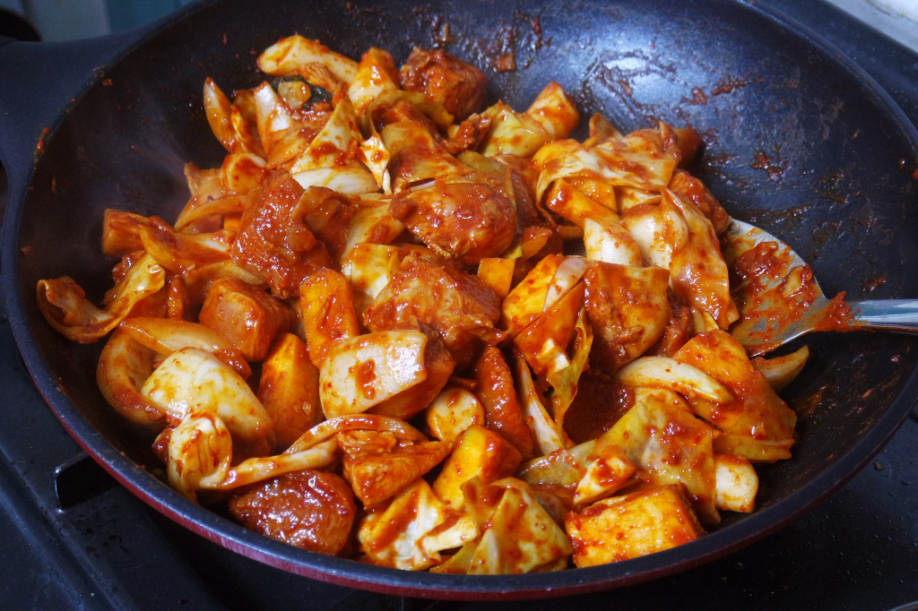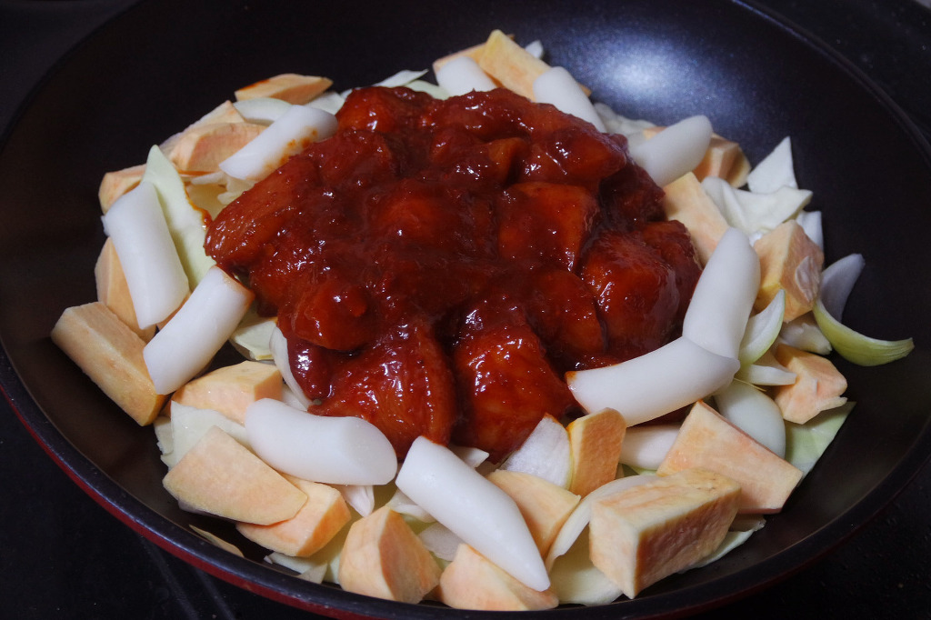 (양배추 1/6통, 고구마 1개, 양파 1개, 깻잎 15장, 떡볶이떡 소량 사용)