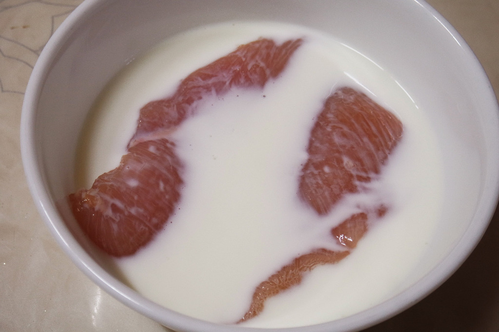 먼저 닭가슴살 비린내 제거를 위해 우유에 2-30분간 담구어 둡니다.