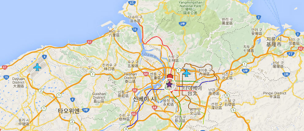 맨 왼쪽 비행기 모양이 타오위안 공항, 가운데 별이 내가 머문 숙소, 빨간 색이 타이베이메인역, 오른쪽 비행기가 송산공항!