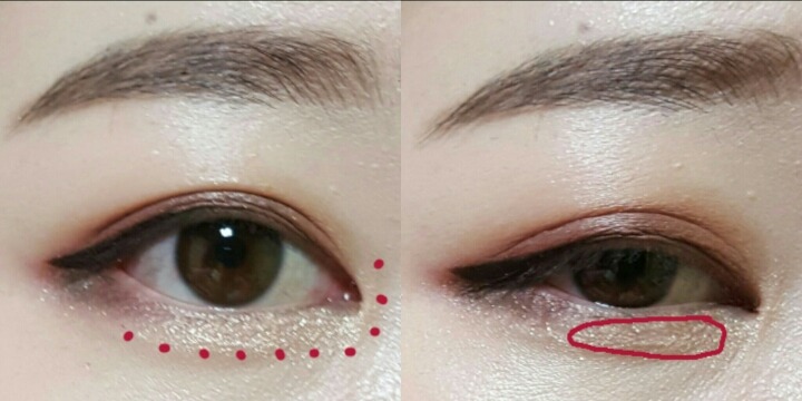 빨간동그라미 안쪽은 눈을 살짝떴을때 주름이지는데 여기는 붓으로 슥슥 문질러서 펄을 털어줘야해